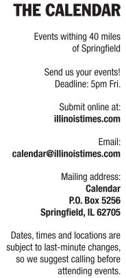 Bicentennial and Beyond! The Illinois Legacy Collection Oct 11-17, 9am-4:30pm Mon-Sat, 12-4:30pm Sun. Major exhibition features rare and rarely-seen artifacts from the Museum’s 13.5 million-object Illinois Legacy Collection to highlight the dynamic story of Illinois. $5 adults; free to members, youth, seniors, military and veterans. illinoisstatemuseum.org. 558- 6696. Illinois State Museum, 502 S. Spring St., 782-7386.