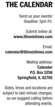 Great Futures Gala Oct 18, 5-8:30pm Thu. Featuring live music, heavy hors d’oeuvres, and an awards presentations for Youth of the Year and Volunteer of the Year. Hosted by and in support of the Boys & Girls Clubs of Central Illinois. $50. tmathis@bgccil.org. Erin’s Pavilion, Southwind Park, 4965 S. Second St., 585- 2941.
