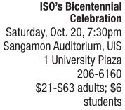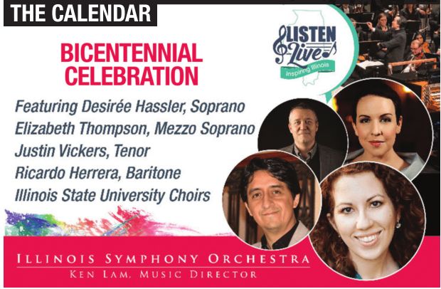 Don’t miss the performance that kicks off the Illinois Symphony Orchestra’s 2018-2019 season on Saturday, Oct. 20, at 7:30 p.m. in Sangamon Auditorium. The ISO’s Bicentennial Celebration concert features pieces that celebrate the Illinois Bicentennial, such as Joan Tower’s first “Fanfare for the Uncommon Woman,” an adventurous piece that pays tribute to female risk-takers; Aaron Copland’s “Lincoln Portrait,” a composition that reflects upon some of Abraham Lincoln’s greatest speeches; and the powerful “Ode to Joy” of “Beethoven’s Ninth Symphony.” Concert comments will take place at 6:30 p.m. in the main auditorium. Tickets are available online at http://sangamonauditorium.org or by calling the Sangamon Auditorium box office at 206-6160. Tickets cost $21, $42 or $63 for adults and $6 for students. For more information about the Illinois Symphony Orchestra, visit http://ilsymphony.org. See also