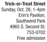 On Sunday, Oct. 28, families are invited to “Trick-or-Treat Street,” a free and safe trick-or-treating event for children ages 12 and under at Erin’s Pavilion in Southwind Park. This rain-or-shine event hosted by Mid-West Family Broadcasting features dozens of local businesses offering entertainment, demonstrations and candy to all entrants, as well as a haunted trailer courtesy of Recon Techs. Food items will be available for purchase and alternative treat options will be available to children with food allergies. More information about “Trick-or- Treat Street” can be found online at http://facebook.com/ events/583040792115819/ or by calling 629-7077.