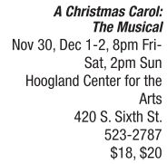 Warm your heart this holiday season by taking in the Springfield Theatre Centre’s musical adaptation of Charles Dickens’ most-loved story. With music by Alan Menken and lyrics by Lynn Ahrens, A Christmas Carol: The Musical is the tale of Ebenezer Scrooge, a prosperous curmudgeon who values personal wealth above the happiness and comfort of others. On Christmas Eve, Scrooge is forced to face his selfish ways when he is visited by three ghosts who lead him through his Past, Present and Future. This is the wake-up call that Scrooge needs, and he then spends Christmas Day reconnecting with and sharing love with those who matter the most to him. Admission to A Christmas Carol: The Musical costs $20 for adults and $18 for students and seniors. Tickets can be purchased online at http://hcfta.org or by calling the Hoogland’s box office at 523-2787. See also