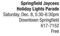 Enjoy holiday cheer on Saturday, Dec. 8, during the 47 th annual Springfield Jaycees Holiday Lights Parade. This festive downtown parade celebrates the start of the holiday season and is a time-honored tradition that began in 1949 and has been held annually since 1972. The parade will begin at 5:30 p.m. in the Horace Mann parking lot and will loop around the Old State Capitol to Monroe Street along Fifth and Sixth streets. Since this parade occurs after dark, all parade entries are decked with holiday lights and the festivities conclude with a visit from a special North Pole guest, Mr. Santa Claus himself. For more information about the Springfield Jaycees and the annual Holiday Lights Parade visit http://SpringfieldJaycees.net or find the Springfield Jaycees on Facebook. See also