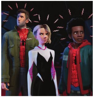 You’d think you’d need a scorecard to keep all these spider characters straight, but Lord hits the pause button each time a new one is introduced to give viewers a quick review of their respective origins, each the same but a bit different. There’s a tongue-in-cheek, post-modern attitude towards all of this as if Lord and the film’s three directors are freely admitting the derivative nature of these characters yet embracing them all the same. Spider-Man Noir is the most inspired of these, what with him being rendered in black-andwhite hues, personal gusts of wind and trench coat outfits, and an outrageous construct made all the more so by Cage’s manic dialogue delivery concerning existential angst and moral ambiguity.