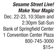 When Justin, magician extraordinaire, visits Sesame Street to perform a magic show for the neighborhood, Elmo desperately wants to be part of the big show. The problem is, Elmo cannot perform magic, so he teams up with Abby and Justin to “discover the power of yet.” During Sesame Street Live! Make Your Magic, Elmo learns that with a bit of perseverance and practice, you can do anything you set your mind to. See Elmo, Abby and Justin along with their friends Cookie Monster, Big Bird, Grover, Rosita and Count von Count during these magical children’s performances on Saturday, Dec. 22 and Sunday, Dec. 23. Admission begins at $15, and tickets can be purchased online at http:// theboscenter.com or by calling the Bank of Springfield Center’s box office at 800-745-3000. See also