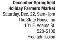 Shop local to find delicious ingredients for your holiday meal during the December Springfield Holiday Farmers Market on Saturday, Dec. 22 from 9 a.m. to 1 p.m. at The State House Inn. The free event features more than 30 vendors selling a variety of products such as pasture-raised meats, eggs, honey, cheese, greens, carrots, potatoes, turnips, radishes, sunchokes, winter squashes and more plus baked goods, wine and local gifts. Also during the event, Slow Food Springfield will offer children’s activities and lunch will be available for purchase courtesy of Smart Natured. Future dates for the Springfield Winter Farmers Markets are Jan. 19, Feb. 16, March 16 and April 20. For more information about this event, find the Old Capitol Farmers Market on Facebook or call the Illinois Stewardship Alliance at 528-1563. See also