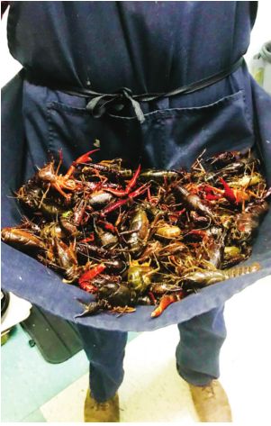 armful of the squirming crawfish onto it for transport into the kitchen.