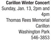 On Sundays and Wednesdays, listen for the sound of the Thomas Rees Memorial Carillon as Springfield Park District’s carillonneur, Carlo van Ulft, plays a wide variety of music from original carillon compositions to arrangements of classical, folk and popular music for the winter season. The Carillon Winter Concerts will continue through April 28 on Sundays at 2 p.m. and 4 p.m. and Wednesdays at noon. When the carillon is not being played, the Westminster Chime will sound on the quarter hour with a melody that grows as the hour advances, culminating in an hour strike at the top of the hour. This method of indicating time is centuries old. To learn more about the Thomas Rees Memorial Carillon including events, tours and its history, visit carillon-rees.org or call 546-3853.