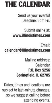 Bicentennial and Beyond! The Illinois Legacy Collection Jan 17-30, 12-4:30pm Sun, 9am-4:30pm Mon-Sat. Exhibition features rare and rarely-seen artifacts from the Museum’s 13.5-million-object Illinois Legacy Collection to highlight the dynamic story of Illinois. Through Feb. 3. $5 adults ages 19-64. illinoisstatemuseum.org. 217-782-7386. Illinois State Museum, 502 S. Spring St., 217- 782-7386.