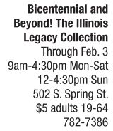 You still have time to visit the Illinois State Museum’s exhibition celebrating Illinois’ 200 th anniversary of statehood. “Bicentennial and Beyond! The Illinois Legacy Collection” includes works of art and also pieces that are of anthropological, archaeological, botanical, geological and zoological interest. The items were chosen for the unique stories they tell about Illinois. Recognizing that the story of Illinois goes well beyond the last 200 years, artifacts will range from 400-million-year-old fossils to contemporary art. Visitors will see a helmet worn by a World War I soldier, a trunk brought by German immigrants in 1852, a core segment from Route 66, a piece of contemporary art created of cowhide, an Olney albino gray tree squirrel mount and a portrait miniature done by an itinerant Illinois artist, among many other items. The exhibition runs through Feb. 3. Admission is $5 for adults age 19-64 and is free for children, seniors, veterans and museum society members.