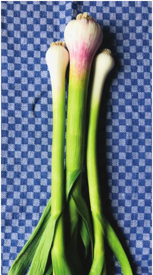 Green garlic speaks of spring and has a much milder taste as compared to mature cloves. Both the stalks and bulb of green garlic can be used to add gentle flavor to sautés, soups and stir-fries. Green garlic can also be eaten raw and used in salads or sand wiches.