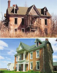 For years the house and land sat empty and fell into disrepair – the roofline sagged, windows had been broken out, brush covered the foundation, and the interior had been damaged by rodents and termites as well as looters who had ripped out fireplace mantels etc. Robert Hanson acquired the property in 1990 and began some restoration – adding windows, shoring up the floors, etc. His work was key for any future restoration.