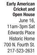 The history of cricket goes back to 16th century England. It later made a successful leap across the Atlantic and eventually made its way to this area by the early 1800s. For a time, it was almost as popular as baseball. Visitors to Edwards Place can try their hand at this venerable English tradition with short, informal 19th century-style cricket games led by American cricket player and historian Tom Melville. Edwards Place Historic Home will also be open for free selfguided tours. The event is part of Springfield Convention and Visitors Bureau’s History Comes Alive program which runs through Aug. 10. Ongoing events at the historic home also sponsored by the program include Wednesday afternoon ice cream socials with the Lincolns and learning about the household chores with a portrayer of the home’s servant, Annie Sage, on Friday afternoons.