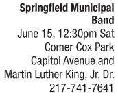 Municipal bands are a tradition in many towns and cities nationwide, and Springfield is fortunate to have one. In fact, for over 80 years the Springfield Municipal Band has been providing summer entertainment for devoted followers and fans. The band is managed by Ken Pratt who has a bachelor’s in music theory and jazz studies, and is a 20- year band member. Tom Philbrick, who has a master’s in music education, has conducted the band for over eight years. You will find the band at Douglas Park most Tuesday evenings during the summer, but they will also perform at a variety of outdoor venues, such as the Old Capitol Plaza, Southwind Park and the Illinois State Fair, throughout the season. This weekend they are set to perform at the annual Juneteenth Celebration at Comer Cox Park. The performance is free.