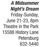 This comedy, written by William Shakespeare in the 1590s, portrays the events surrounding the marriage of Theseus, the Duke of Athens, to Hippolyta, including the adventures of young Athenian lovers and a group of amateur actors who are controlled and manipulated by fairies who inhabit the forest. This particular adaptation of Midsummer Night’s Dream, directed by Katie Bulava and Phillip Heppe, is set in New Orleans during the Jazz Age where the Court of Theseus has a more urban feel and the wedding celebration comes to life with a Mardi Gras atmosphere and lively music. The play is one of Shakespeare’s most popular works for the stage and is widely performed around the world. Admission is $15 for adults, $13 for seniors and $10 for ages 12 and under. theatreinthepark.net.