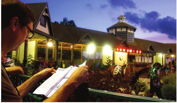As clouds approach, folks repack and scurry to the grandstand, but a dozen or so make it no farther than a large tent where draft beer costs $7.50 and Bloody Marys come in plastic cups. Men in drenched suits and ties appear through the deluge, not running but certainly hustling, and throw canvas covers over electronic terminals that gobble money from bettors. The tent’s frame and guy wires and stakes are made from metal, which shrieks and grinds in the wind as parts rub against each other. No reach is spared rain – it’s not clear whether it is blowing in from the side open to the track, through a billowing roof or both.