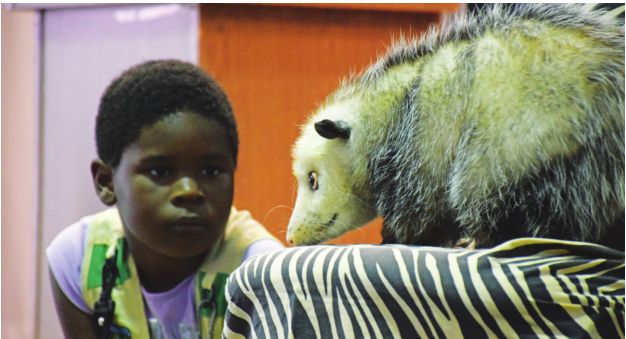 woman from the Henson Robinson Zoo introduces an auditorium full of