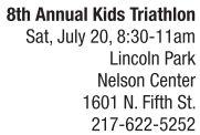 Kids ages 5-13 are invited to participate in the 8 th annual triathlon hosted by HSHS St. John’s Children’s Hospital, Scheels and the Springfield Triathlon Club. The mini tri for ages 5 and 6 begins with a 50-meter pool swim, followed by a 0.6- mile bike ride and 0.25-mile run. The triathlon for 6 to 13-yearold participants (broken down into different age categories) begins with a 100-meter swim, followed by a 1.25-mile bike ride and a half-mile run. Safety is a priority for the participants. In the pool, the kids will be assisted by certified lifeguards and local swim team members as needed. As athletes transition from water to wheels, volunteers will guide them, secure their helmets and continue to cheer the young participants on through the run course and to the finish line. First, second and third place awards will be given in each age category for boys and girls. Medals will be given to all finishers because, you know, finishing a triathlon is a big deal. The race entry fee is $25 and includes a T-shirt, goodie bag and refreshments. Registration information can be found at spitriclub.com.