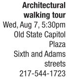 Illinois Realtors is sponsoring walking tours of buildings of architectural interest in the historic district of downtown Springfield. This week, join Anthony Rubano from the Historic Preservation Division of the Illinois Department of Natural Resources as he guides a tour through the area of the Old Capitol Plaza and Sixth Street. See and hear about the unique architectural designs, histories and stories of such places as Tinsley Dry Goods, Maldaner’s Restaurant, the Booth and Ferguson buildings, Firestone Complete Auto Care and the Hoogland Center for the Arts. The tour will end with a reception highlighting the SAA Collective. To attend, meet the tour group at the Lincoln family statue on the southeast corner of the Old State Capitol Plaza at 5:30 p.m. It is free and will last 1 1/2 hours. The final two walking tours of the season are scheduled for Sept. 4 and Oct. 2. Free.