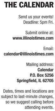 Museum After Hours: 80s and 90s Night Aug 23, 5-8pm Fri. Relive the 1980s and 90s with games, objects from the Museum collection, door prizes and dance music provided by a DJ. $10 members and $15 non. 217-782-6044. Illinois State Museum, 502 S. Spring St., 217-782-7386.