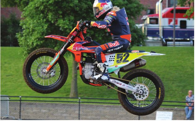 “I’m the smallest rider in the series,” she says. Racing motorcycles are light, but not as light as Texter, who weighs 100 pounds and rides bikes weighing about 230 pounds. Recently, she joined the Red Bull KTM factory racing team to become the first rider of singlecylinder flat-track bikes to land full factory sponsorship. She’s cultivated a following in a sport where more powerful twin-cylinder bikes have traditionally gotten the most attention.