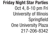 Since 1980 the astronomy and physics program at the University of Illinois Springfield has hosted the Friday Night Star Parties and offered opportunities to view other astronomical occurrences such as lunar and solar eclipses and comets. UIS associate professor of astronomy and physics John Martin will lead the parties this year. Viewings may include a number of celestial objects including Jupiter, Saturn, Earth’s moon, the Ring Nebula and several star clusters. The parties begin with a presentation about galaxies, the sun and stars, and then visitors are invited to view the skies through the telescopes provided and ask questions. In a temporary change from past parties, the telescopes will be set up on the patio outside of the former PAC restaurant on the belowground level between Sangamon Auditorium and Brookens Library until the observation deck gets repaired. The Friday Night Star Parties will continue through Oct. 25, weather permitting, and visitors are welcome to stop in anytime between 8-10 p.m. Free. See also