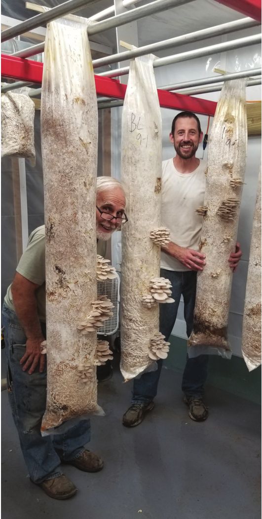 Now, thanks to the Mushroom Farmacy, a new venture started by August Jones and Ben Kruger, fungi-hungry foodies won’t have to traipse though the woods to get their hands on exotic varieties of delicious and nutritious mushrooms. Jones teamed up with Kruger to begin designing and building a facility where these mushrooms can be cultivated and sold to the public year round. Kruger owns and operates Beaver Creek Woodworks on North 10 th Street in Springfield. Jones and Kruger are longtime family friends, and Jones recounts one day he was visiting Kruger in his woodshop. “I looked up and there was this giant mushroom growing on the ceiling. And I thought, we could probably raise mushrooms in here.” The building which housed Beaver Creek Woodworks was formerly Tri-County Foods, a wholesale butcher shop, and the room with the mushroom on the ceiling had once been an enormous walk-in freezer. Jones, who was raising and selling produce at the time, realized the thick insulated walls would be perfect for creating the kind of warm, moist environment necessary for growing mushrooms.
