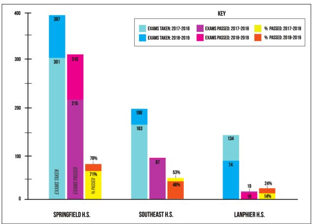 Springfield High School was a bright spot, with both the number of exams taken and the number of threes or better increasing beyond national averages in the most recent test cycle. Last spring, Springfield High School students took 397 AP exams, 96 more than in the prior year, and 78% of exams were graded at three or better. The year before, 71% of the 301 exams taken were scored three or better.