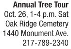 Take a stroll through Oak Ridge Cemetery during the sixth annual Tree Tour on Oct. 26. Learn about 19 majestic trees, some dating from 1862, others only 10-15 years old, including unique specimens grafted by Guy Sternberg. The oldest Osage orange tree in Springfield is the star tree and other specimens include ash, maple, oak and sycamore. An interpreter will be stationed at each tree to provide information, and each tree has a QR code, accessible with a cell phone. Allow at least an hour to complete the self-guided tour and enjoy music from the dulcimer group Wildwood. Follow signs for parking. Most trees will be located near the entrance on J. David Jones Parkway and maps are available. The Tree tour is sponsored by Oak Ridge Cemetery Foundation along with the City of Springfield, Oak Ridge Cemetery, Starhill Forest Arboretum and Sue and Kent Massie.