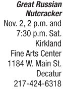 Moscow Ballet, a Russian ballet company, consistently produces record-breaking seasons, thrilling audiences from New York City to Los Angeles and from Puerto Rico to Calgary. Sold-out theatres attest to the public's love and appreciation of its high quality, classic ballet productions. The Moscow Ballet returns to Decatur this week to perform the holiday favorite the Great Russian Nutcracker. Featuring Tchaikovsky’s timeless score, Moscow Ballet's immersive Christmas classic will include 10-foot-tall puppets, spectacular hand-painted backdrops, beautifully costumed Russian dancers and young local dancers, hand-selected from the community. Seats are $29-$69. millikin.edu. See also