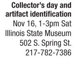 The Illinois State Museum’s collector’s day and artifact identification event will focus on anthropological artifacts, rocks, minerals, fossils and bones. Museum visitors are invited to bring items to be identified by staff members and other experts. Those who bring photos of objects or specimens are encouraged to include a ruler or coin in the photo for a size comparison. The participating experts will do their best to correctly identify objects, however no guarantees are made and, due to time constraints, only one object per person may be identified. Objects brought for identification will not be appraised and no buying, selling or trading is allowed at the event. Collectors will also be at the event with displays of their meteorites, fishing reels, historic photographs and wood carvings. They will speak to visitors about the stories of each collection. illinoistatemuseum.org.