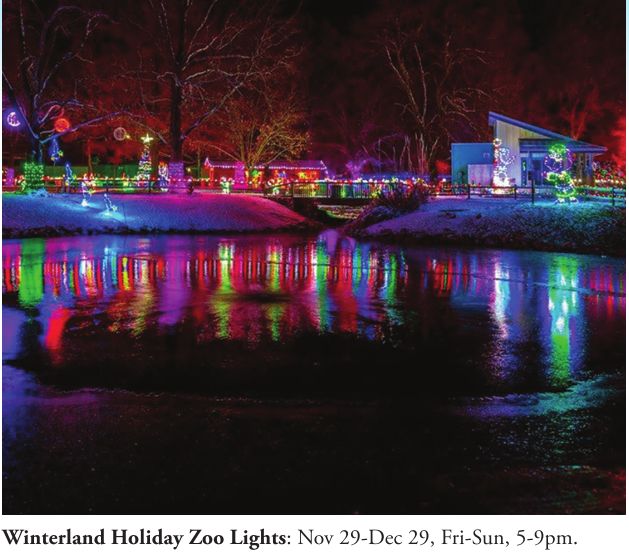 Winterland Holiday Zoo Lights Nov 29-Dec 29, Fri-Sun, 5-9pm. Stroll through the zoo as you admire the light displays. Enjoy some hot beverages or fresh sweets while you warm up near the bonfire. There will be caroling, performances and, of course, a visit from the big guy. $7 adults, $5 children 3-12, age 2 and under are free. Henson Robinson Zoo, 1100 E. Lake Shore Dr., 585-1821.