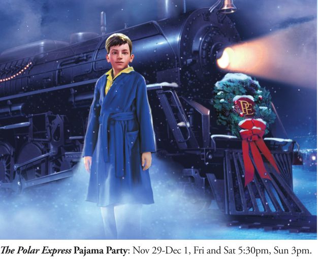 The Polar Express Pajama Party Nov 29-Dec 1, Fri and Sat 5:30pm and Sun 3pm. Everybody in their jammies for crafting and cocoa before a screening of the film. Includes a photo with our special guest from the North Pole. Sensory-friendly party and screening. Sat, Nov 30, 1pm. The Legacy Theatre, 101 E. Lawrence, 800-838-3006.