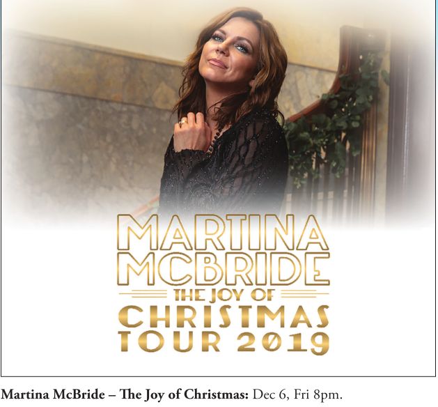 Martina McBride – The Joy of Christmas Dec 6, Fri 8pm. A multiple Grammynominated country music icon. $39.50+. UIS Performing Arts Center, One University Plaza, 206-6160.