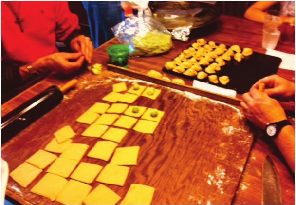 The event was hosted at the Rochester home of Jeremy Venturini. In a family tradition that goes back several generations, Jeremy represents the fourth generation. I walked in holding my bowl of curried cauliflower and onion hummus and surveyed the crowd. Holding court in the middle of Jeremy’s kitchen was his father, John Venturini, surrounded by his siblings, his children, nieces and nephews. John was spreading flour atop a well-worn cutting board and rolling out balls of dough with his mother’s special white marble rolling pin. The multi-generational assemblage of ravioli apprentices were eager to learn the craft and carry on the family tradition.