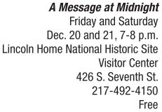 Lincoln Home National Historic Site invites the community to attend a special performance of A Message at Midnight, a one-act play set on Christmas Eve of 1864. Celebration is far away from the mind of President Abraham Lincoln as he awaits the news from General Sherman as the general marches towards Savannah, Georgia. A victory would help assure the passage of the 13th Amendment and provide a life-saving boost to the morale of the North. A defeat may be the final blow to hopes of reunion and freedom for the enslaved. Midnight approaches as General Ulysses S. Grant arrives to meet the president with the news. A Message at Midnight is based on a Ken Bradbury production and features Fritz Klein as Abraham Lincoln, Pam Brown as Mary Todd Lincoln and Dennis Rendleman as Ulysses S. Grant.nps.gov.