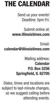 Community Yoga Mondays, 5:15-6:30pm. Wear comfortable clothes and bring a mat. A few mats are available to borrow. Open to any adult and all skill levels, but the class is geared toward beginners. Free, but donations to the instructor are welcome. Family Service Center, 710 E. Vine St., 217-528-8406.