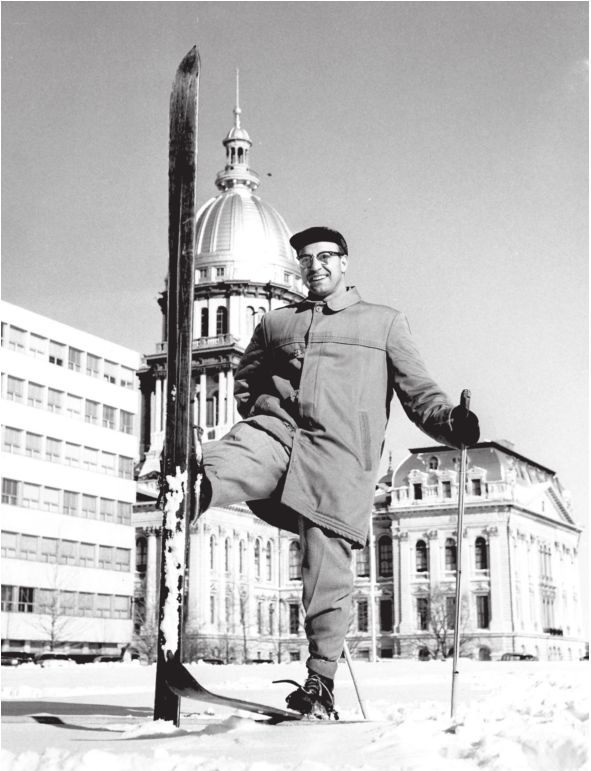 Throughout his life, Ray enjoyed the outdoor activities of his childhood, especially fishing. As a skier, he made news in the Jan. 15, 1964, State Journal- Register. Determined to show up for work despite drifted snow, Ray strapped on skis and trekked two miles to the Stratton Building, then the home of IDOT. An SJ-R photographer photographed a grinning Ray with the Capitol in the background. At the age of 83, Ray water skied, to Margaret’s dismay. Ray Ackerman was not ready to leave early from the skiing game.