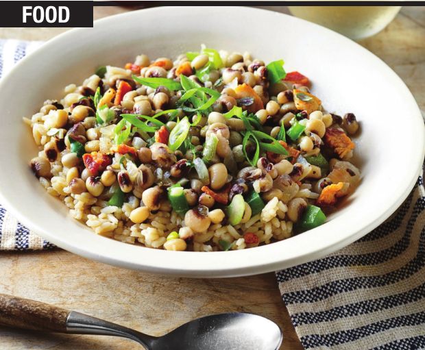 rice, served with cornbread and greens on the side. The black-eyed peas,