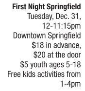FAIRS & FESTIVALS | An alcohol-free celebration of arts Join the Springfield Area Arts Council for the 33 rd annual First Night Springfield celebration featuring regional and local artists and performers. The festivities begin with complimentary children’s performances and activities inside Springfield High School from 1-4 p.m. followed by a concert on the Barton Theater organ by Mark Gifford from 4:15-5:45 p.m., also at Springfield High School. Additional music, dance, improv comedy, drama, storytelling, magic and art performances will occur from 5-11:15 p.m. inside the Hoogland Center for the Arts, the Lincoln Home Visitors Center, Kari Bedford Photography Studio and Lincoln Library, and a celebratory fireworks display will take place at 8 p.m. from the intersection of Fourth Street and Capitol Avenue. First Night Springfield is an alcohol-free event. Admission to First Night Springfield is by wristband, and wristbands cost $18 in advance (must purchase by Dec. 30) for adults or $20 at the door and cost $5 for youth ages 5-18. First Night Springfield wristbands are available for purchase at all Bank of Springfield locations, the Hoogland Center for the Arts or online at http://hcfta.org. See also