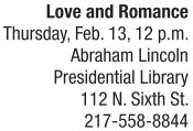 Tucked away in the Abraham Lincoln Presidential Library’s vaults are love letters, Valentine’s Day cards, romantic books and beautiful pictures from Valentine’s Days past. Join ALPLM manuscripts curator Christopher Schnell as he discusses changing attitudes about love, romance, dating and relationships using material from the 19th and 20th centuries. The audience will be invited to view rare items from library collections, such as saucy poetry and love letters from the 1850s, diary entries of lonely Civil War-era singles, machine-made Victorian Valentine’s Day cards and vinegar Valentines from the roaring ’20s. Reservations are not required. alplm.org. See also