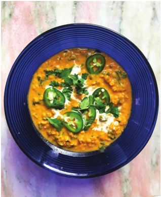Heat the olive oil over medium-high heat in a large nonreactive soup pot. When the oil is shimmering add the onions, garlic and ginger and cook until softened and lightly browned, about 3-4 minutes. Add the curry powder, pepper and lentils and stir to combine, then add the tomatoes, coconut milk, water and herbs. Stir well and season to taste with salt. Bring to a boil, then reduce heat and simmer for 20-25 minutes, until lentils are tender. Stir in the spinach. Season to taste with salt and pepper. Garnish with a dollop of yogurt, chopped herbs and sliced chilis, if desired.