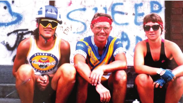 He doesn’t ride as much as he once did, but he’s got plenty of pictures. Hundreds of tents pitched in fields by cyclists on organized tours. The Eiffel Tower. An Indianapolis velodrome, where Hall rode a few laps. Here’s one taken in West Virginia, when the bulk of a coast-to-coast organized group ride in 1989 was mostly finished. Hall is flanked by two riding partners much younger than himself. They’d hit their stride in Montana, the three of them, riding back-to-back centuries together, each of the 100-mile rides taking less than five hours. No mercy was shown. “She really struggled to hang on, but she did,” Hall says of the young woman seated beside him.