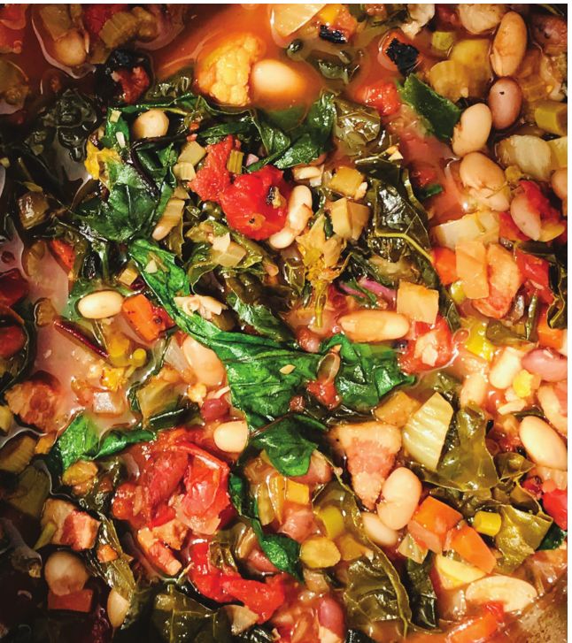 Add the chopped, canned or fresh tomatoes and cook until most of the liquid has evaporated. Then add the beans and their cooking liquid to the pot. If you have a block of Parmesan, cut off a piece of the rind and add it to the soup. After the soup simmers about 10 minutes you can start adding in any remaining vegetables in sequence according to their density and cooking time. For example, diced potatoes, fennel, kale, celeriac go in early. Spinach and chard should be added later. If the minestrone is to be consumed the day of preparation, pasta can be added and cooked until al dente. If the soup is to be eaten later, add the pasta after rewarming.