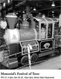 Memorial’s Festival of Trees Nov 27, 4-8pm, Nov 28-30, 10am-8pm. A holiday tradition featuring trees, wreaths and centerpieces; entertainment, a gingerbread village, the candy cane express train and the holiday market filled with unique gifts. $5 adults, $2 children. Orr Building, the Illinois State Fairgrounds. For more info, call 788-4301 or go to www.MemorialsFestivalofTrees.com.