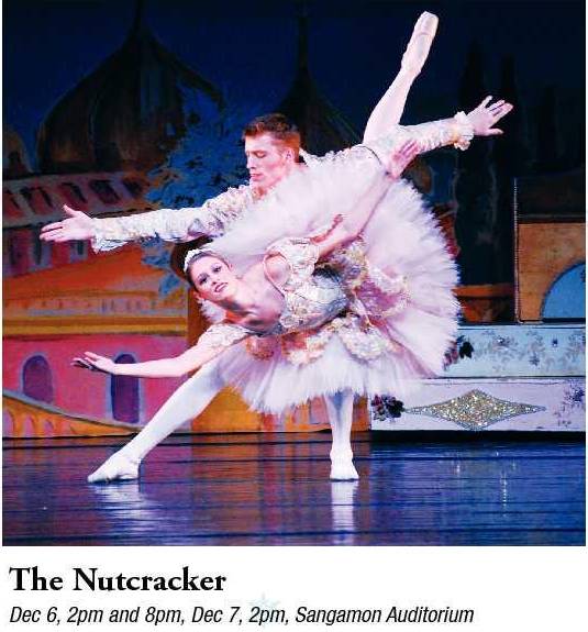 The Nutcracker Dec 6, 2pm and 8pm, Dec 7, 2pm, See the magic of Christmas come alive at The Nutcracker. This year’s production will feature new costumes and choreography. $25 adults, $23 seniors, and $15 students and children. Sangamon Auditorium. For more info, call 206- 6160 or go to www.uis.edu/sangamonauditorium/tickets.