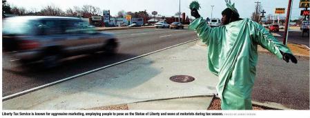 He made an appointment at the Liberty store on Wabash, and sat down with a “nice lady” named Debbie. She couldn’t tell him how much her services would cost until she had actually typed in all the numbers. As I later learned from store manager Chris Beckett, Liberty’s fees are based on the number and types of forms a taxpayer requires. These fees are calculated by the computer; even Beckett can’t see the fee for a form. Alex had five W-2’s (Starbucks, Journeys, The Gap, Verizon, and a bank) plus 1040s for his college tuition. As it turned out, having Liberty do his taxes would cost him $263, or, with Liberty’s current 30-percentoff special, $184. Debbie gave Alex six choices, including the option to do his own taxes for free on Liberty’s Web site, libertytax.com, on his home computer, and wait up to two weeks for his refund. At the other end of the spectrum was the option to get his refund money within 48 hours from the Liberty store.