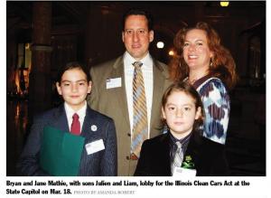 Julien and Liam Mathie, 10- and 9-year-old brothers from the western Chicago suburb of La Grange Park, woke up at 5 a.m., put on suits and ties, and drove to Springfield with their parents last Wednesday to promote the Clean Cars Act. It was the second time the junior lobbyists — considered “pros” by Environment Illinois, dad Bryan says — joined other environmentalists at the State Capitol in pushing legislators to adopt stricter automotive emission standards.