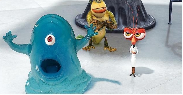 Too bad its story isn’t up to snuff, coming off as a Pixar retread with a striking lack of emotion. Taking a fond look back at the Sci-Fi flicks of the ’50s, the film’s characters are all allusions to creatures that came to life in cinema’s nuclear age. The Missing Link (voice by Will Arnett), Dr. Cockroach (Hugh Laurie), B.O.B. (Seth Rogan), Ginormica (Reese Witherspoon) and Insectosaurus are distant cousins of the Creature from the Black Lagoon, the Fly, the Blob, the 50-Foot Woman and Godzilla and have all been captured and quarantined by the U.S. government. The Feds aren’t quite sure what to do with them, but they do know letting them wander about suburbia is a bad idea. However, when an alien invasion occurs, led by Gallaxhar (Rainn Wilson), the monsters are turned loose to stop the threat.