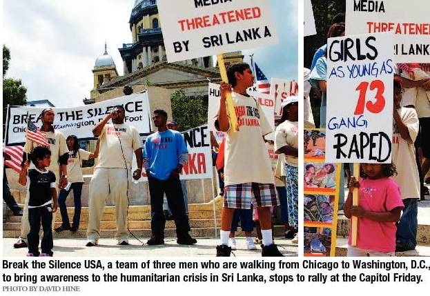 The trio left the Richard J. Daley Center in Chicago on May 26 and headed south for Springfield. Sreekantha, the team leader of Break the Silence USA, told the crowd that they chose to rally in the capital city because it’s a “symbolic place of peace.” It was here where Abraham Lincoln promoted equality and where the United States promoted its first black president, he said. “We hope to raise awareness with the general American population to what is happening in Sri Lanka,” Sreekantha said. “The international community is meeting silence — the same thing happened in Darfur. We want to break the silence.”