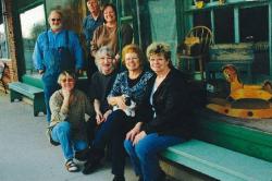 3) Village residents found downtown on a recent afternoon include business owners Peter Neihaus, Bill and Kathy Cosby (standing); artist Renee Sisk, business owner Andrea Neihaus, historian Gillette Ransom, and Linda Gleason (seated).